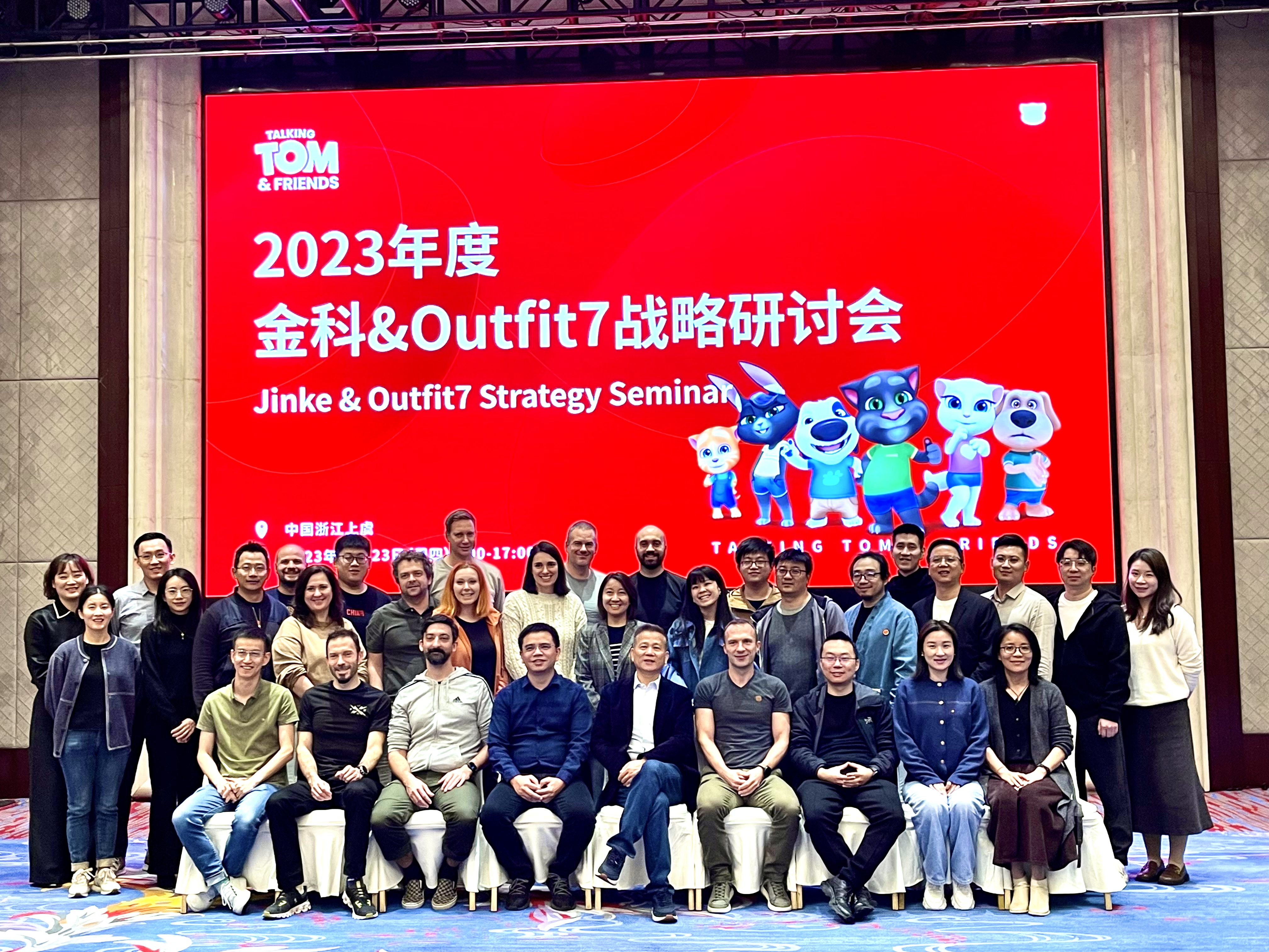 为进一步推进公司业务发展,,,11月22日-26日,,,,公司海外全资子公司Outfit7管理层一行前往中国总部,,,与公司董事长朱志刚先生、、、CEO张维璋先生、、、、COO朱恬女士等公司管理层在绍兴上虞雷迪森云锦大酒店召开2023年度金科&Outfit7战略研讨会。。。。公司高层人员、、、、各业务部门负责人出席会议并参与交流。。