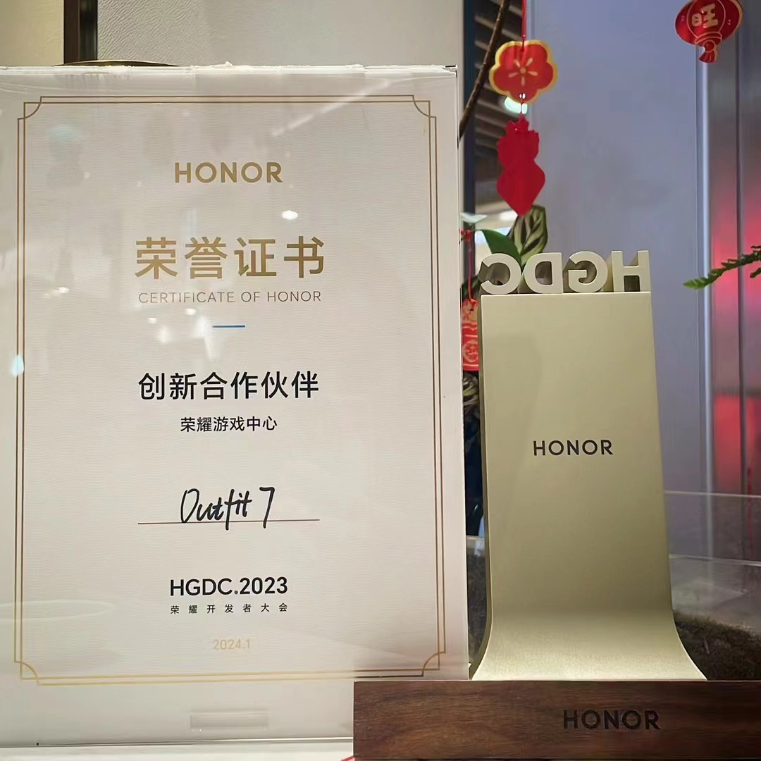 近期,,,,第二届荣耀开发者大会(HGDC 2023)在上海世博中心圆满落幕,,,,Outfit7受邀参会,,,并凭借汤姆猫家族系列产品过硬的品质内容以及创新互惠的合作理念荣膺荣耀游戏中心“创新合作伙伴”称号。。